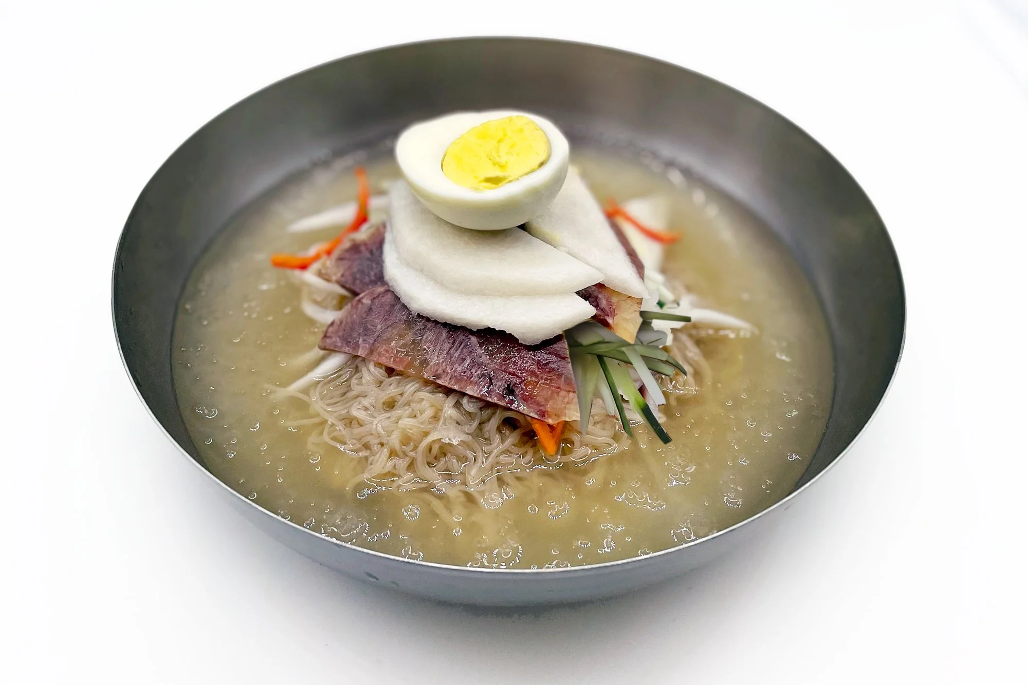 Buckwheat cold noodle in beef broth with pickled veggies and sliced beef and a boiled egg on top.