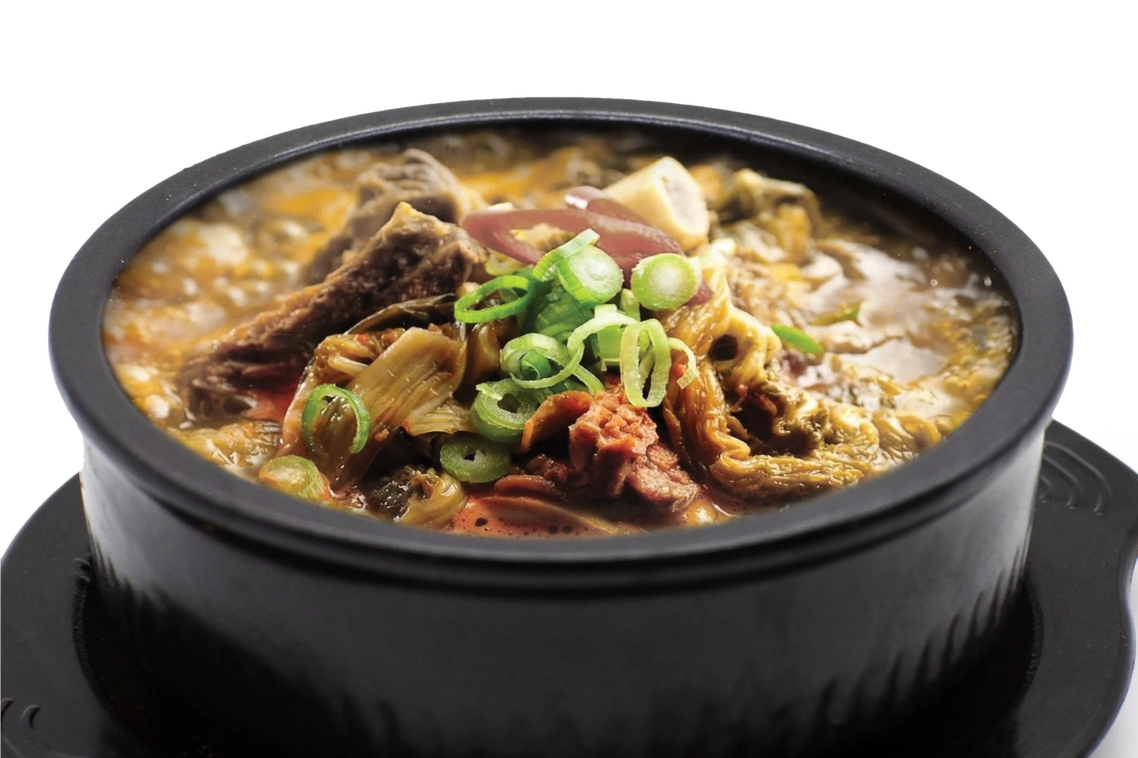 Mild tender short-rib stew with radish, scallion, sweet potato noodles (noodles are not included for take out) and egg drops.