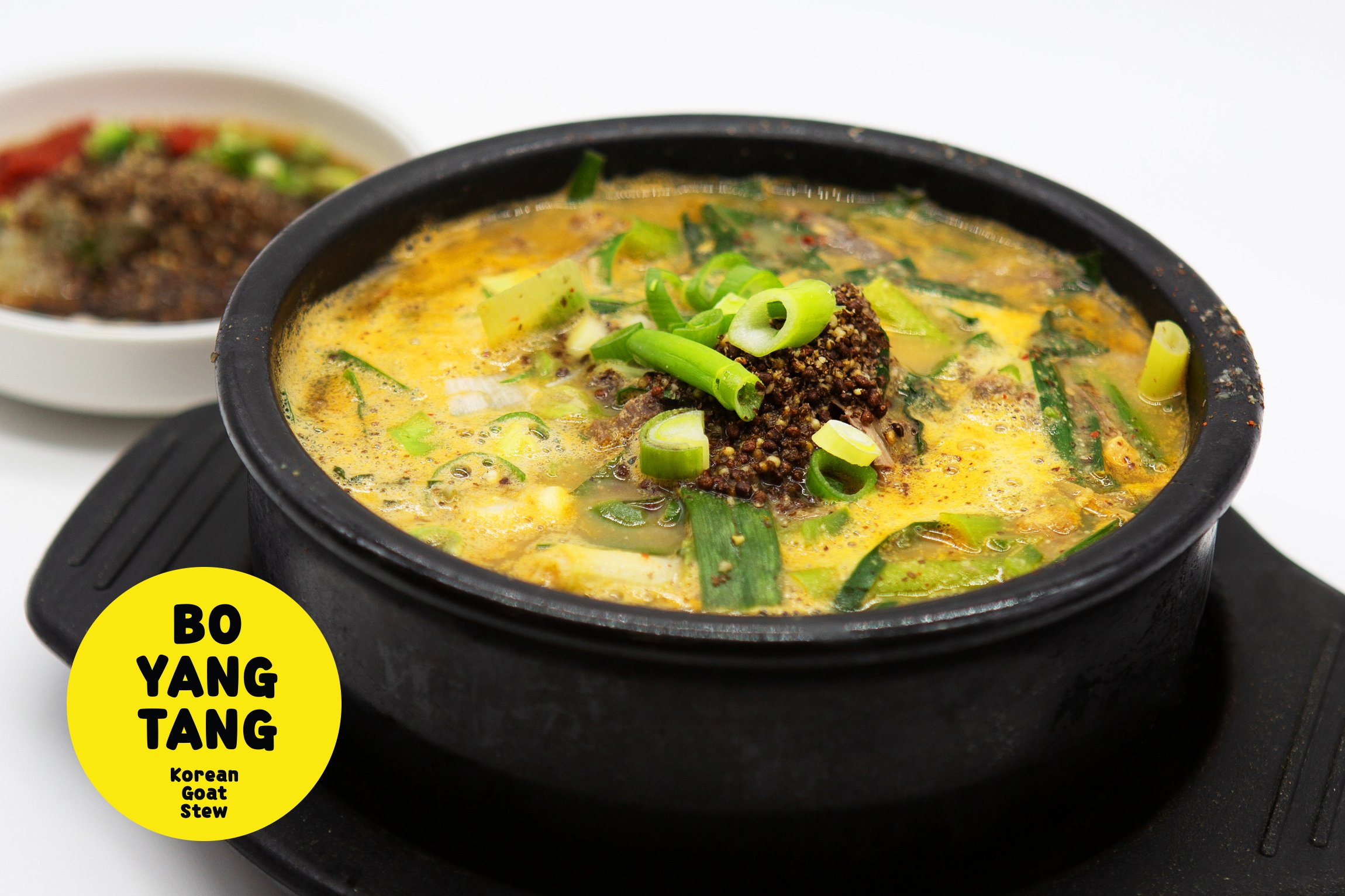 Korean goat stew with chives, perilla leaf, scallions and jalapeños. Served with side dishes and rice.